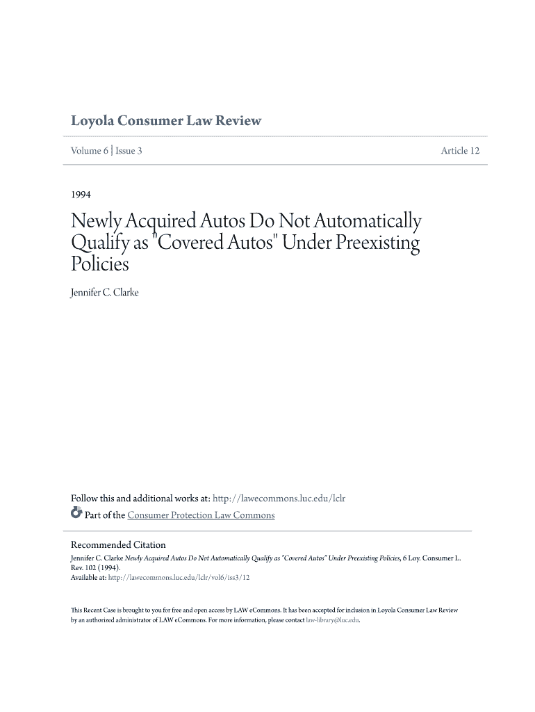 Loyola Consumer Law Review Volume 6 Issue 3Article 121994Newly Acquired Autos Do Not Automatically Qualify as “Covered Autos Under Preexisting Policies Jennifer C. ClarkeFollow this and additional