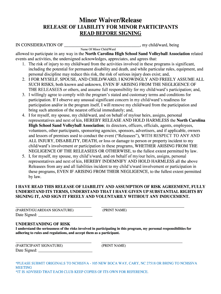 Minor Waiver/Release OF LIABILITY FOR MINOR PARTICIPANTS READ BEFORE SIGNING IN CONSIDERATION OF, my child/ward, being Name Of Minor Child/Ward allowed to participate in any way in the North Carolina