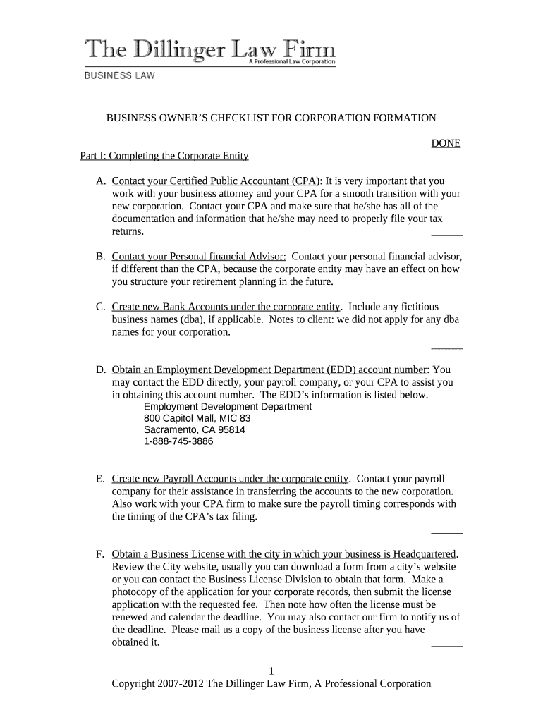 BUSINESS OWNERS CHECKLIST FOR CORPORATION FORMATIONDONE Part I: Completing the Corporate Entity. Contact your Certified Public Accountant (CPA): It is very important that you work with your business