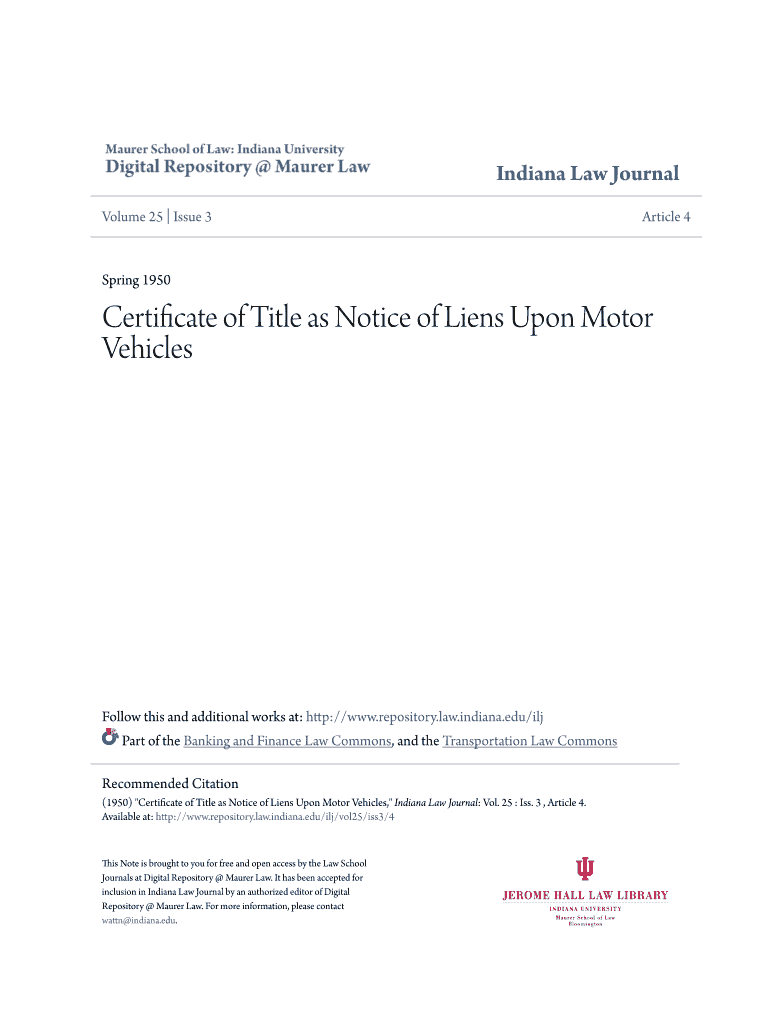 Indiana Law Journal Volume 25 Issue 3Article 4Spring 1950Certificate of Title as Notice of Liens Upon Motor VehiclesFollow this and additional works at: http://www.repository.law.indiana.edu/ilj Part