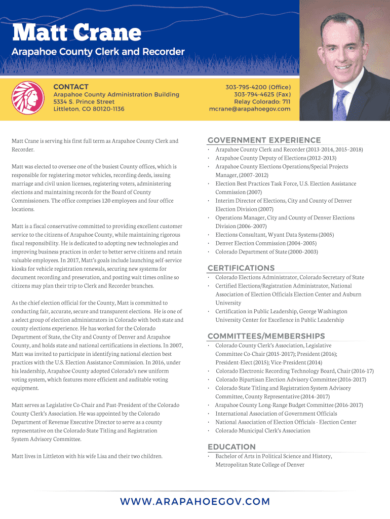 Littleton, CO 801201136Matt Crane is serving his first full term as Arapahoe County