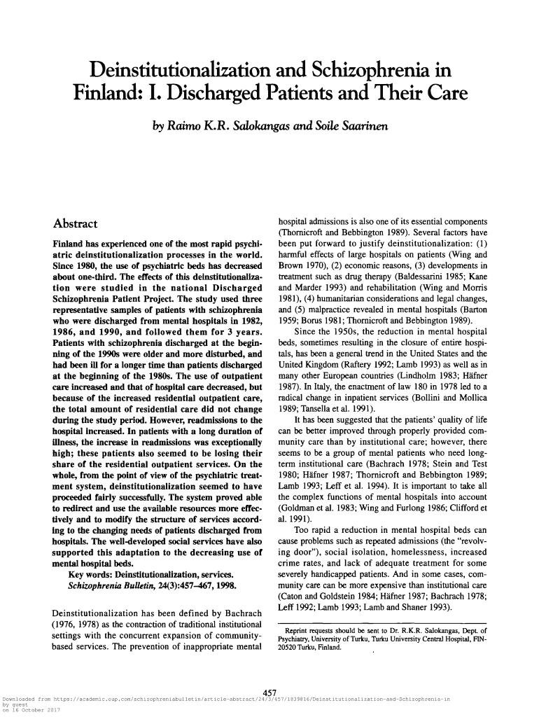 Deinstitutionalization is the process of moving psychiatric patients out of large, state-run institutions and into community-based mental health treatment facilities. Schizophrenia is a chronic and severe mental disorder that affects how a person thinks, feels, and behaves.