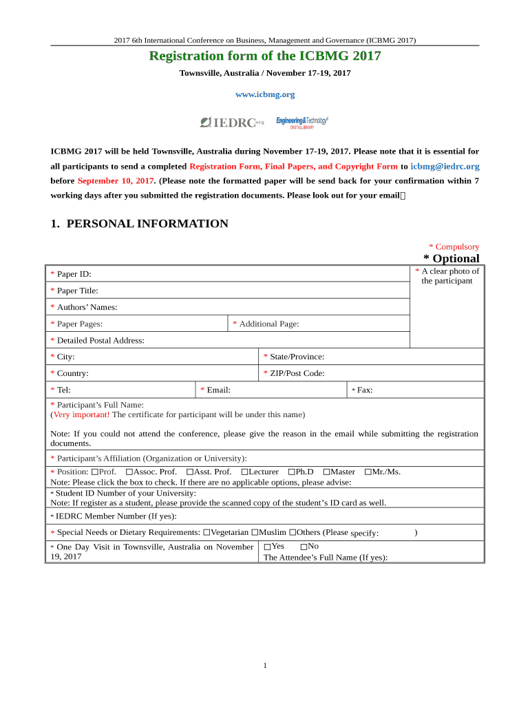 Registration form of the ICBM 2017Townsville, Australia / November 1719, 2017