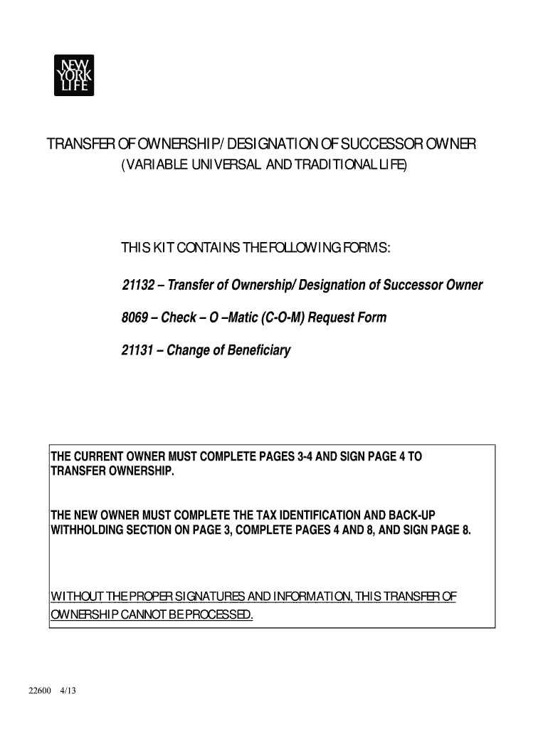 Print... Next TRANSFER OF OWNERSHIP/DESIGNATION OF SUCCESSOR OWNER (VARIABLE UNIVERSAL AND TRADITIONAL LIFE)THIS KIT CONTAINS THE FOLLOWING FORMS: 21132 Transfer of Ownership/ Designation of Successor