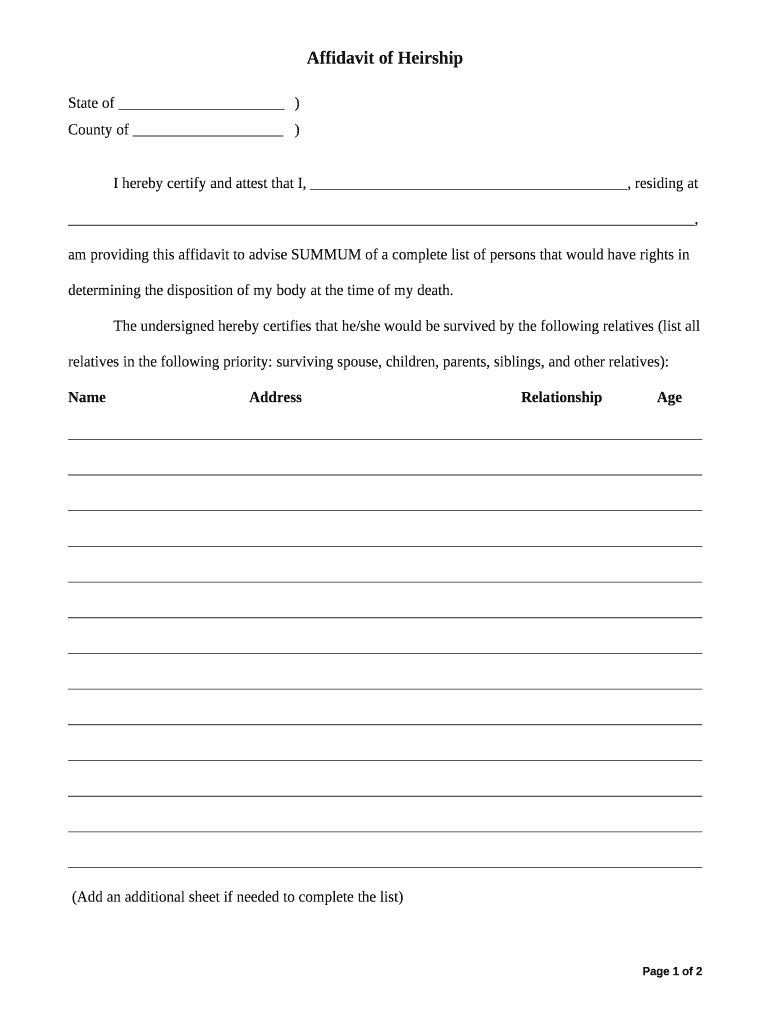 State of) County of)I hereby certify and attest that I, residing at, am I providing this affidavit to advise SUMMER of a complete list of persons that would have rights in determining the disposition