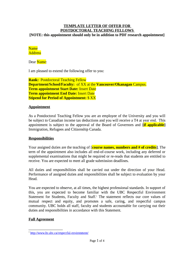 TEMPLATE LETTER OF OFFER POSTDOCTORAL TEACHING FELLOWS×NOTE: this appointment should only be in addition to PDF research appointment×Name