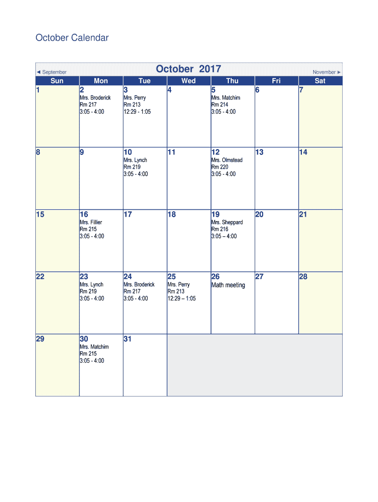 October Calendar October 2017 SeptemberSun1Mon23Mrs. Broderick Rm 217Mrs. Perry Rm 2139103:05 4:008TueWed412:29 1:0517112912181914202127283:05 4:00242526Mrs. Lynch Rm 219Mrs. Broderick Rm 217Mrs.