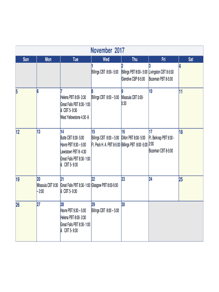 November 2017 SunMonTueWed 1 Billings CBT 8:00 5:00Thu Fri 2 3 Billings PBT 8:00 5:00 Livingston CBT 85:00 Glen dive CBP 85:00 Bozeman PBT 85:00Sat4567 8 9 Helena PBT 8:00 3:30 Billings CBT 8:00 5:00