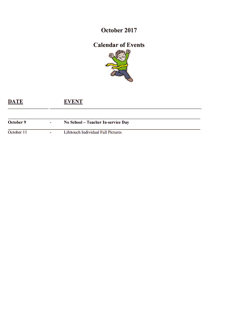 October 2017 Calendar of EventsDATEEVENT October 9 No School Teacher In service Day October 11 Life touch Individual Fall Pictures Dress sharply! October 13 Recess Run for all grade levels with Mr.