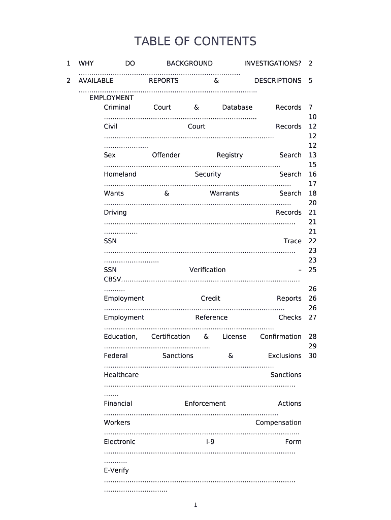 TABLE OF CONTENTS1 WHY DO BACKGROUND INVESTIGATIONS? . 2 2 AVAILABLE REPORTS & DESCRIPTIONS ... 5EMPLOYMENT Criminal Court & Database Records ... Civil Court Records ..... Sex