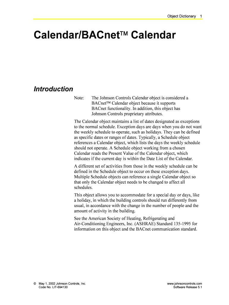 Object Dictionary1Calendar/Backed CalendarIntroduction Note:The Johnson Controls Calendar object is considered a Backed Calendar object because it supports Backed functionality. In addition, this