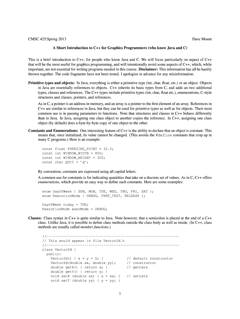 MSC 425:Spring 2013Dave Mount Short Introduction to C++ for Graphics Programmers (who know Java and C)