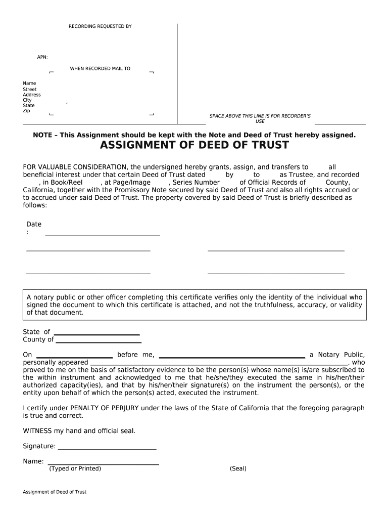 RECORDING REQUESTED BY APN: WHEN RECORDED MAIL Name Street Addressing State Zip, SPACE ABOVE THIS LINE IS FOR RECORDERS SENATE This Assignment should be kept with the Note and Deed of Trust hereby