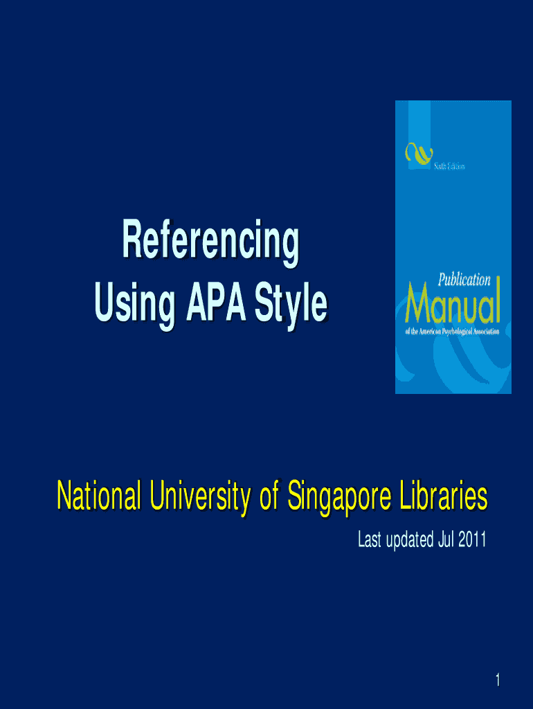 Referencing Using APA StyleNational University of Singapore Libraries Last updated Jul 20111Contents Why cite? Citation in textReference list2Why Cite? To acknowledge intellectual debt To lend support