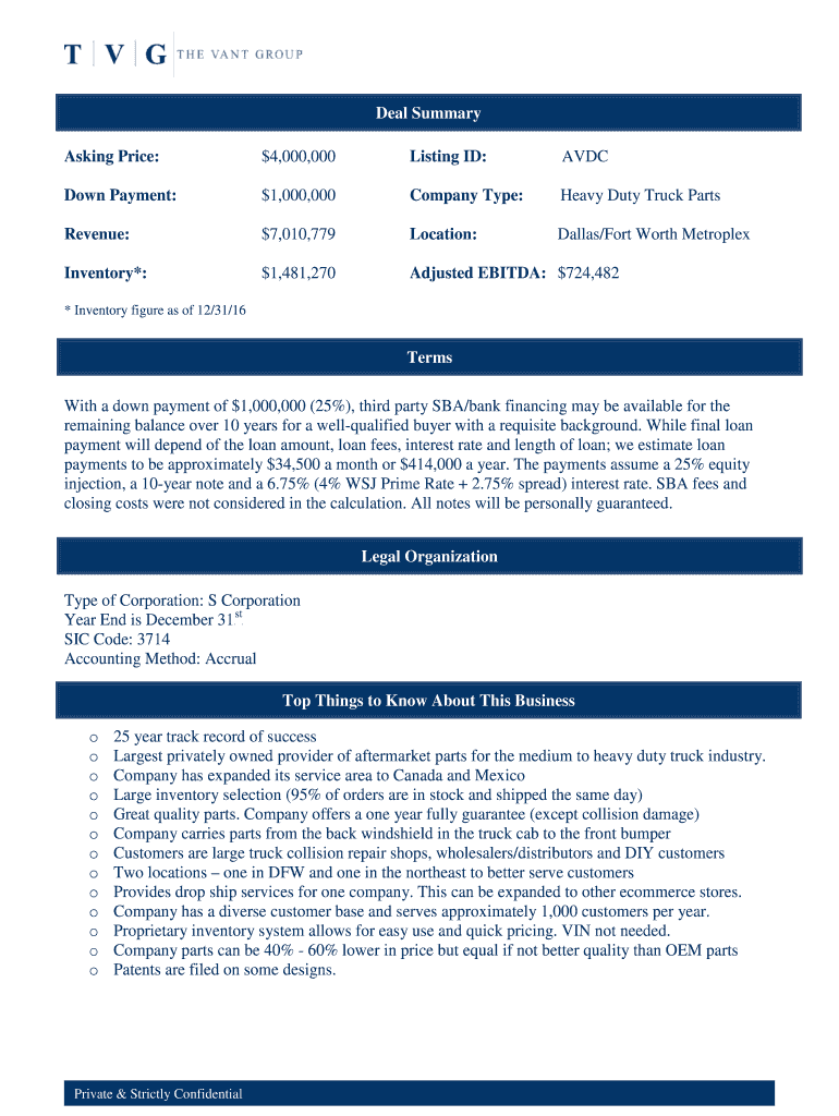 Asking Price:$4,000,000Listing ID:Assclown Payment:$1,000,000Company Type:Heavy Duty Truck PartsRevenue:$7,010,779Location:Dallas/Fort Worth MetroplexInventory*:$1,481,270Adjusted EBITDA: