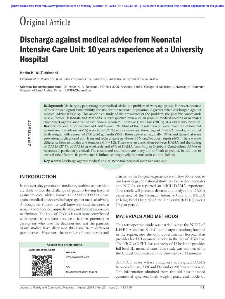 Downloadedfreefromhttp://www.jfcmonline.comonMonday,October14,2013,IP:41.69.63.48 ClickheretodownloadfreeAndroidapplicationforthisjournalO original Article Discharge against medical advice from Neonatal