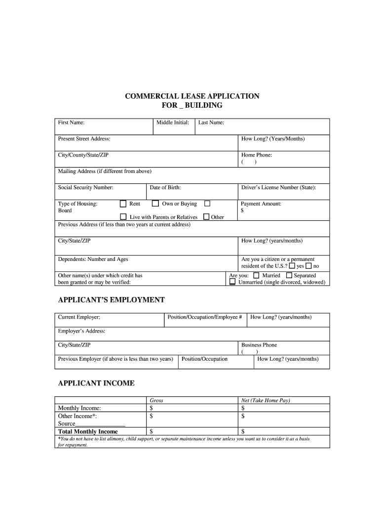 The Commercial Lease Application Form is a rental application document used by potential tenants to apply for a commercial lease.