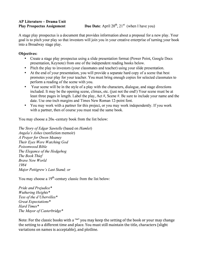 AP Literature Drama Unit Play Prospectus Assignment Date: April 20th, 21st (when I have you)A stage play prospectus is a document that provides information about a proposal for a new play. Your goal
