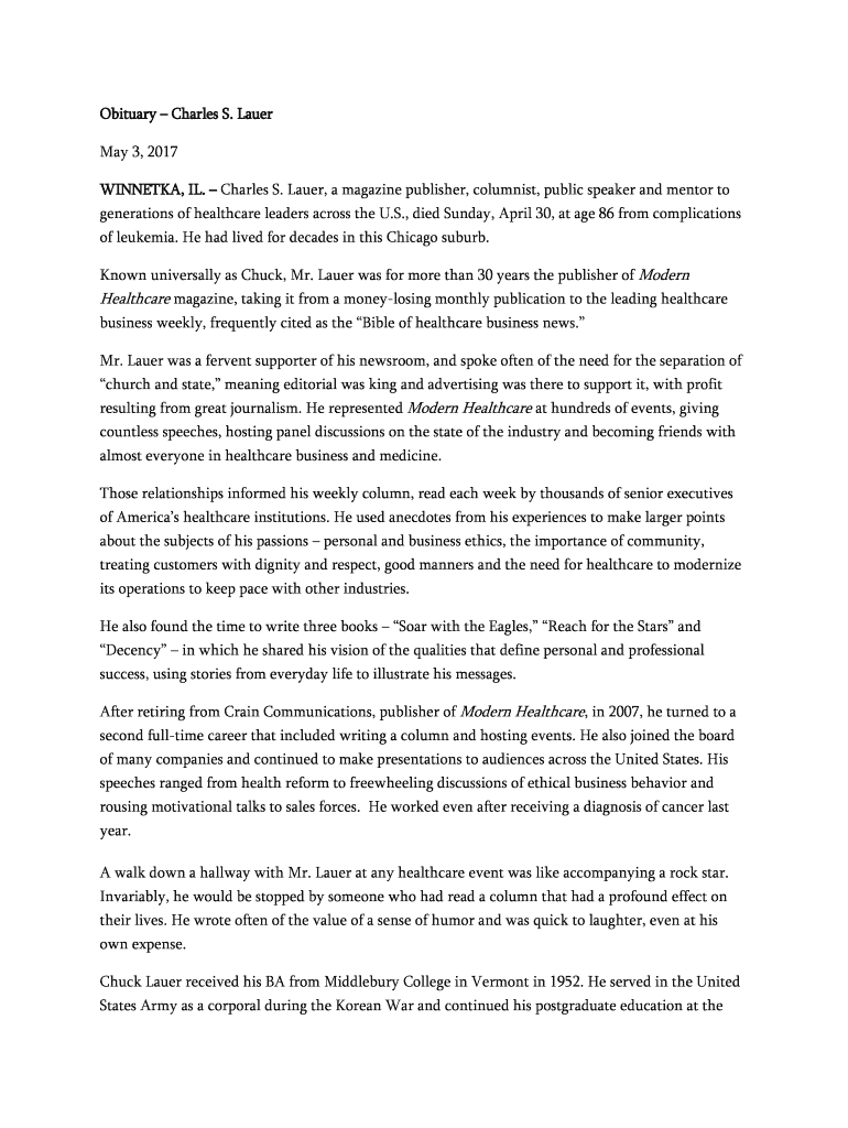 Obituary Charles S. Later May 3, 2017, WINNETKA, IL. Charles S. Later, a magazine publisher, columnist, public speaker and mentor to generations of healthcare leaders across the U.S., died Sunday,