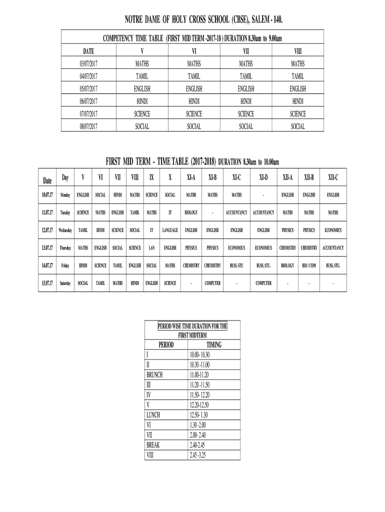 NOTE DAME OF HOLY CROSS SCHOOL (CBSE), SALEM 140. COMPETENCY TIME TABLE (FIRST MID TERM 201718) DURATION 8.30am to 9.00am DATE 03/07/2017V MATH SVI MATHIS MATHSVIII MATHS04/07/2017TAMILTAMILTAMILTAMIL05/07/2017ENGLISHENGLISHENGLISHENGLISH06/07/2017HINDIHINDIHINDIHINDI07/07/2017SCIENCESCIENCESCIENCESCIENCE08/07/2017SOCIALSOCIALSOCIALSOCIALFIRST