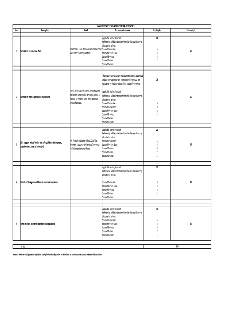 Item1DescriptionSchedule of Construction WorkDetailsVAALPUTS TENDER EVALUATION CRITERIA 2 TRENCHES Documents to provideApplicable Scoring Approach Referencing will be undertaken from the clients and