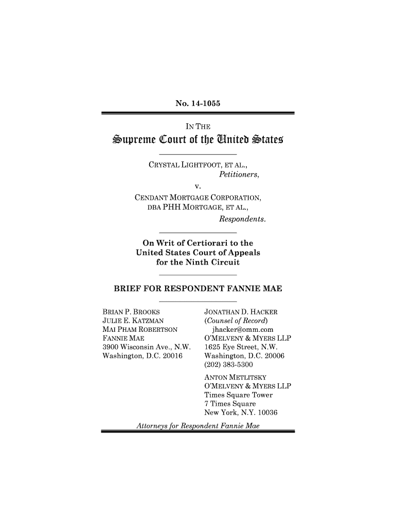 No. 141055 IN Supreme Court of the United States CRYSTAL LIGHTROOM, ET AL., Petitioners, v. PENDANT MORTGAGE CORPORATION, DBA PhD MORTGAGE, ET AL., Respondents. On Writ of Certiorari to the United