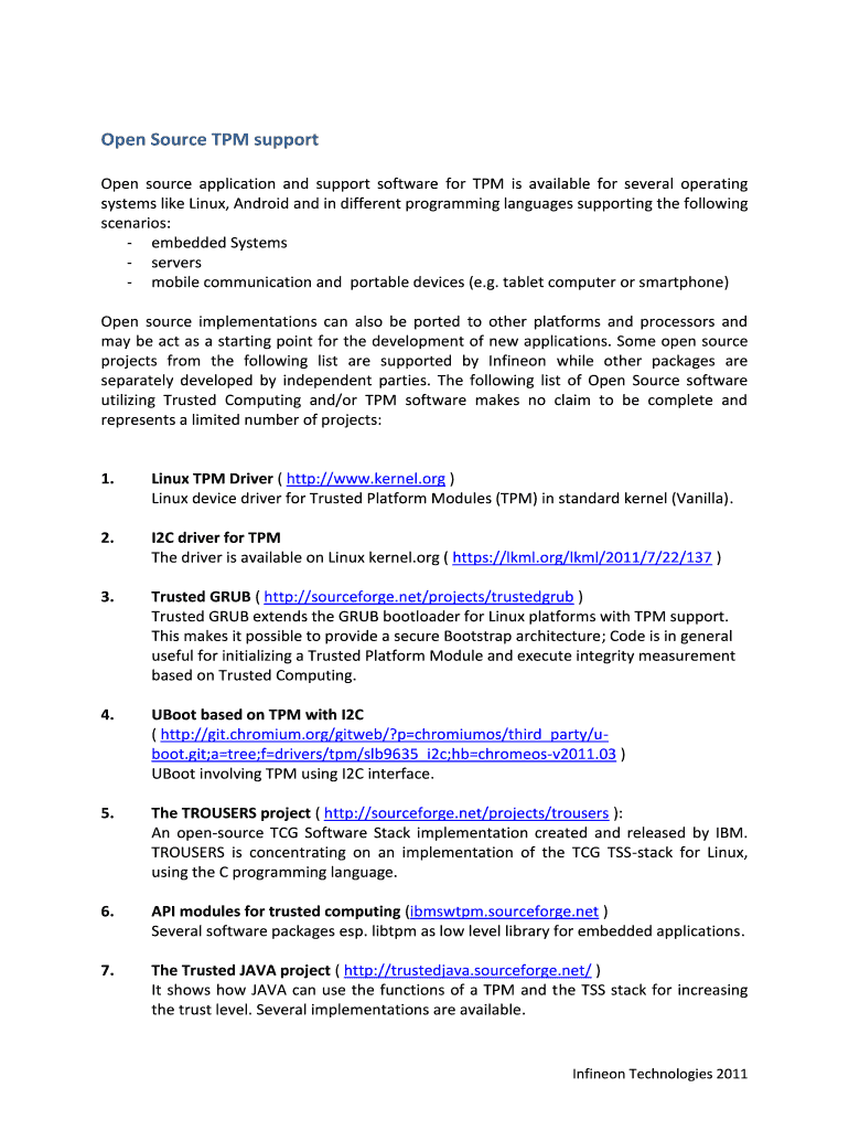 Open Source TPM support Open source application and support software for TPM is available for several operating systems like Linux, Android and in different programming languages supporting the following