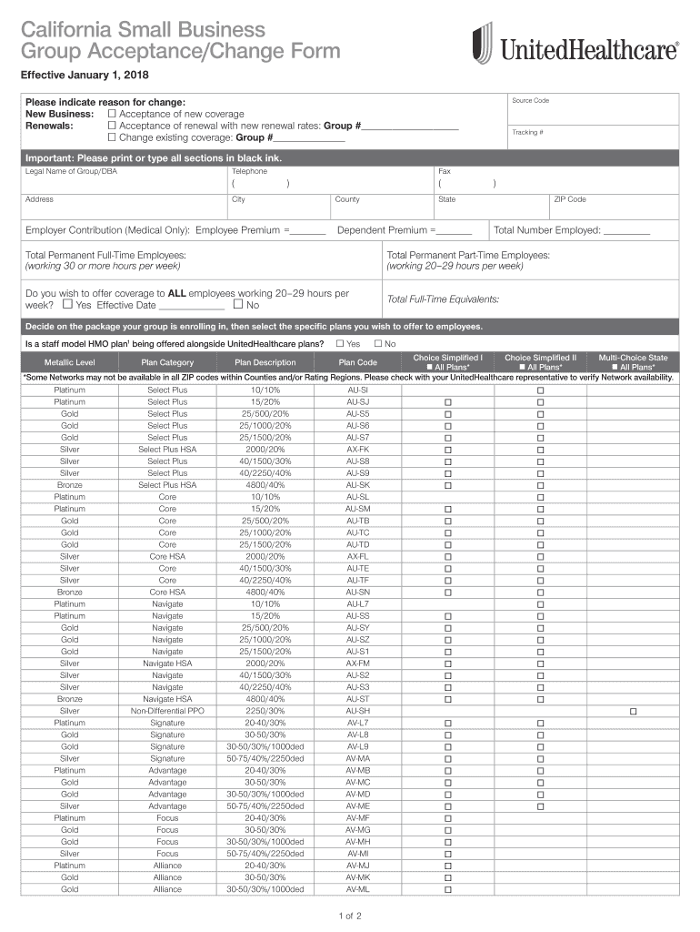 California Small Business Group Acceptance/Change Form Effective January 1, 2018, Please indicate reason for change: New Business: Acceptance of new coverageRenewals: Acceptance of renewal with new
