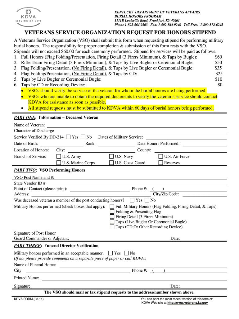 KENTUCKY DEPARTMENT OF VETERANS AFFAIRS BURIAL HONORS PROGRAM 1111B Louisville Road, Frankfort, KY 40601 Phone 15025649203 Fax: 15025649240 Toll Free: 18005726245VETERANS SERVICE ORGANIZATION REQUEST