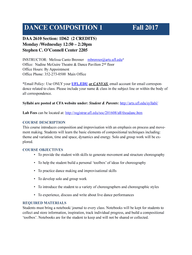 DANCE COMPOSITION 1Fall 2017DAA 2610 Sections: 1D62 (2 CREDITS) Monday /Wednesday 12:50 2:20pm Stephen C. O'Connell Center 2205 INSTRUCTOR: Melissa Canto Brenner arts.NFL.edu* Office: Nadine McGuire