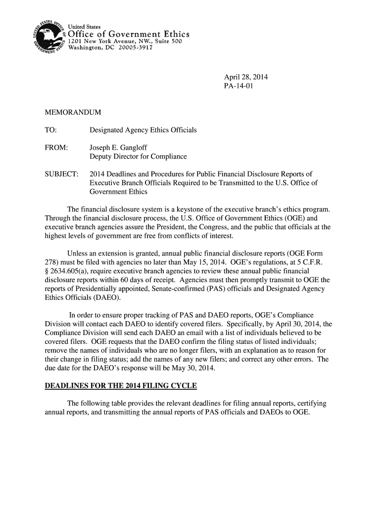Deputy Director for ComplianceSUBJECT:2014 Deadlines and Procedures for Public Financial Disclosure Reports