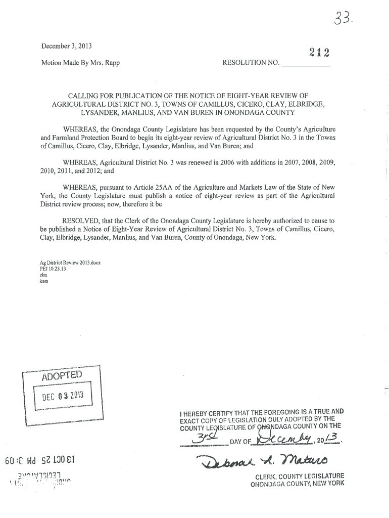 NOTICE OF NIGHTWEAR REVIEW OF AGRICULTURAL DISTRICT 3 TOWNS OF CAMILLE, CICERO, CLAY, ELMBRIDGE, LYSANDER, MARIUS, AND VAN BURENPLEASE TAKE NOTICE that the Onondaga County Legislature has begun its