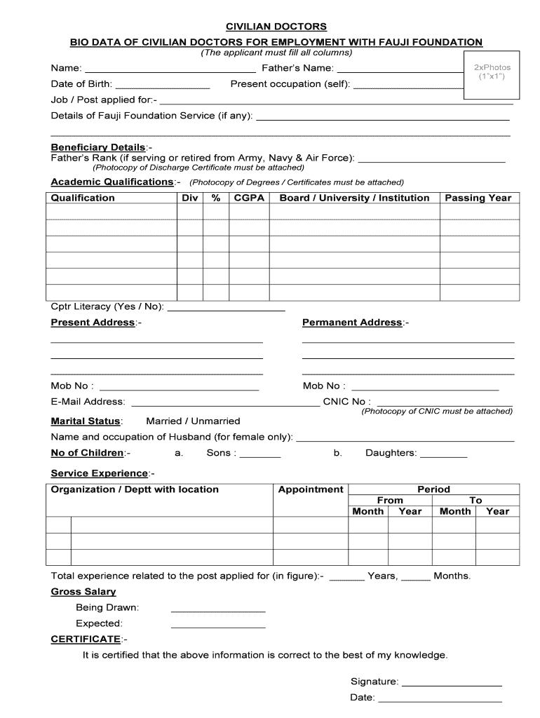 CIVILIAN DOCTORS BIO DATA OF CIVILIAN DOCTORS FOR EMPLOYMENT WITH FUJI FOUNDATION (The applicant must fill all columns)Name: Fathers Name: 2xPhotos Date of Birth: Present occupation (self): (1×1)Job