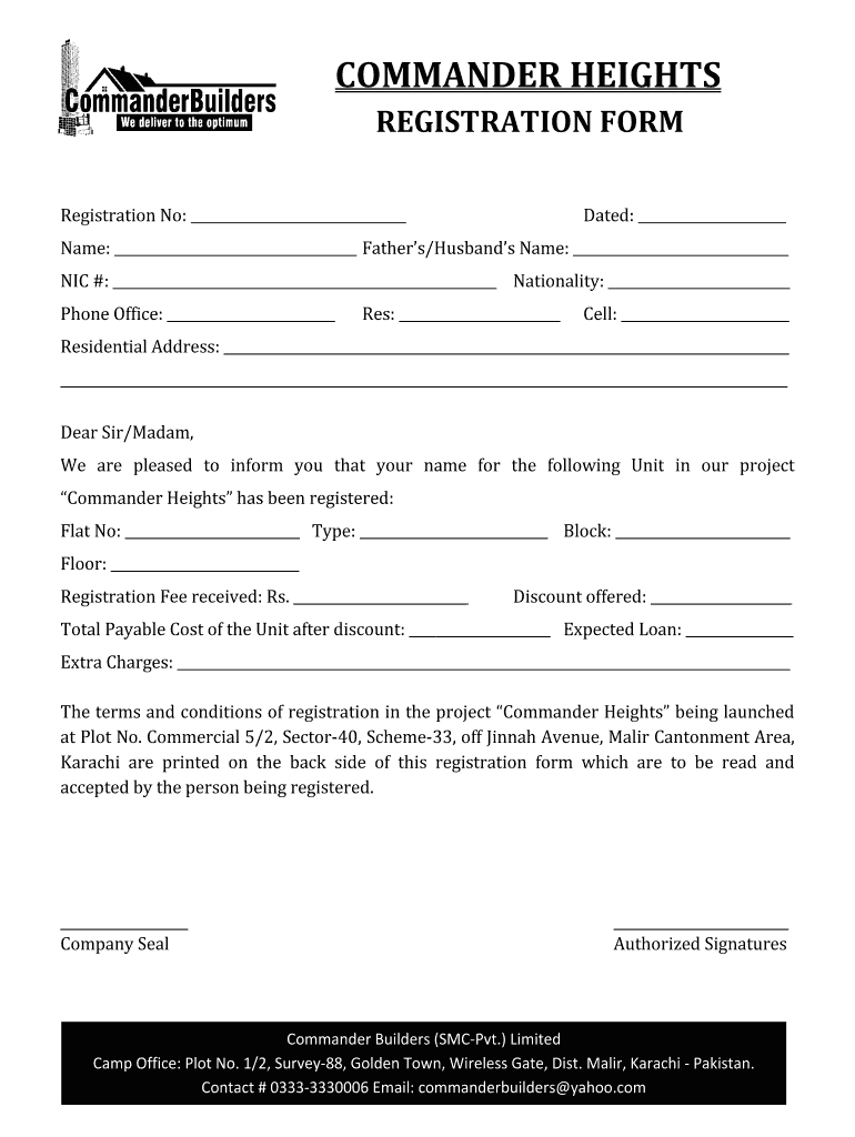 COMMANDER HEIGHTS REGISTRATION FORM Registration No: Dated: Name: Fathers/Husbands Name: NIC #: Nationality: Phone Office: Res: Cell: Residential Address: Dear Sir/Madam, We are pleased to inform