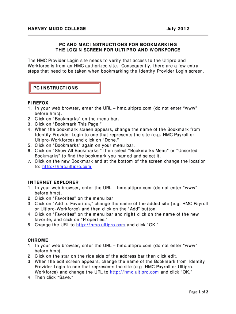 HARVEY MUD COLLEGE July 2012PC AND MAC INSTRUCTIONS FOR BOOKMARKING THE LOGIN SCREEN FOR ULTIMO AND WORKFORCE The HMC Provider Login site needs to verify that access to the Ultimo and Workforce is