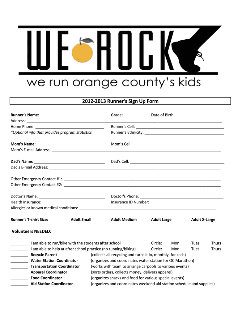 20122013 Runners's Sign Up Form Runner's Name: Grade: Date of Birth: Address: Home Phone: Runner's Cell: *Optional info that provides program statistics Runner's Ethnicity: Mom's Name: Mom's Cell: