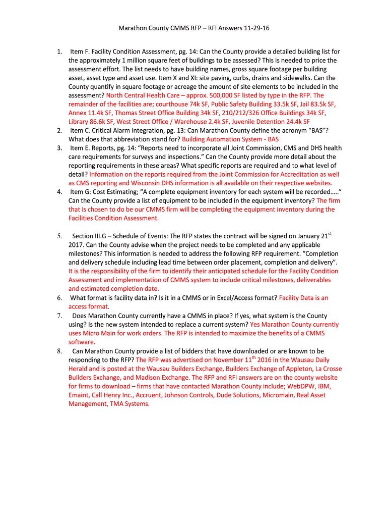 Get the free Marathon County CMMS RFP RFI Answers 11-29-16
