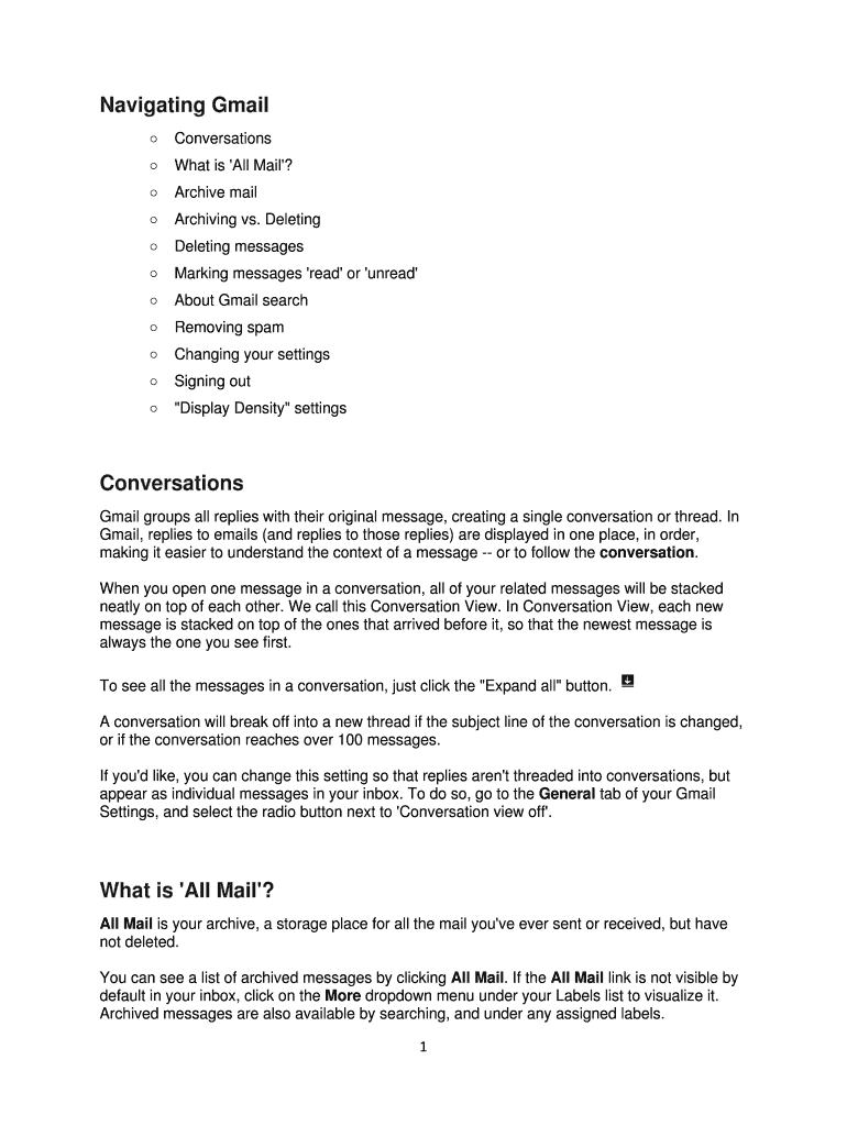 Navigating Gmail oConversationsoWhat is 'All Mail '?archive mailoArchiving vs. DeletingoDeleting messagesoMarking messages 'read or 'unread 'about Gmail searchoRemoving spamoChanging your settingsoSigning