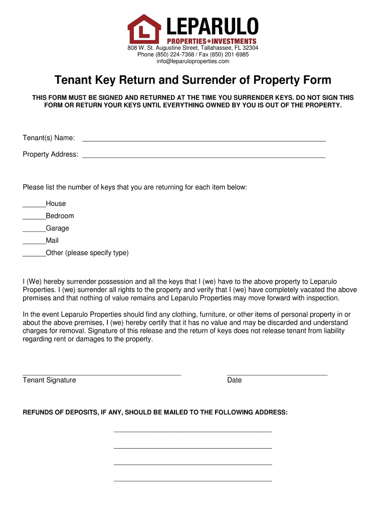 808 W. St. Augustine Street, Tallahassee, FL 32304 Phone (850) 2247368 / Fax (850) 2016985 info leparuloproperties. Covenant Key Return and Surrender of Property Form THIS FORM MUST BE SIGNED AND