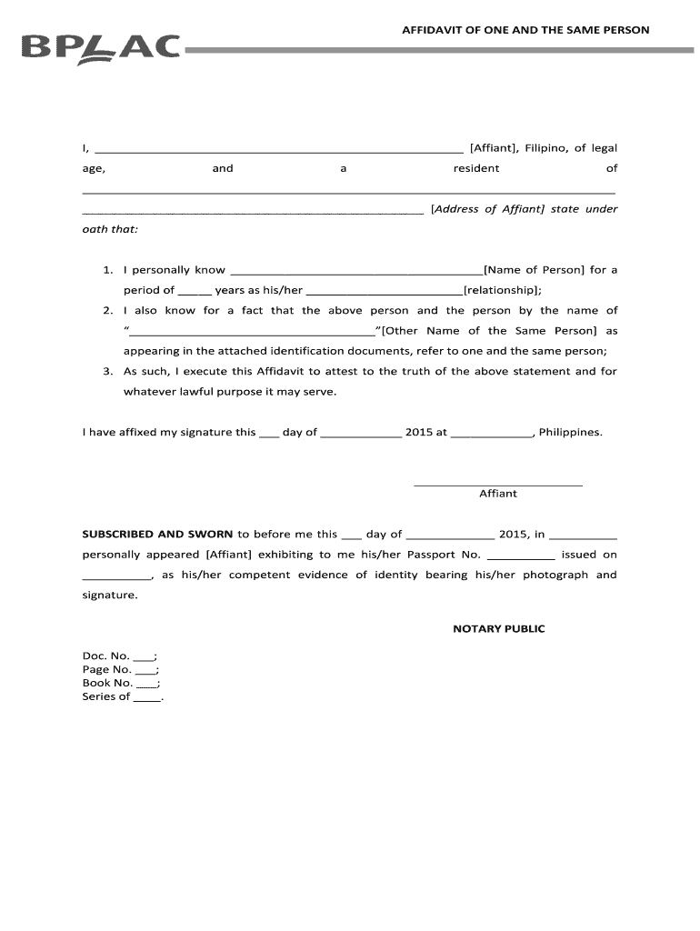 AFFIDAVIT OF ONE AND THE SAME PERSON, Affine, Filipino, of legal age, andaresidentof Address of Affine state under oath that:1. I personally know Name of Person for a period of years as his/her relationship