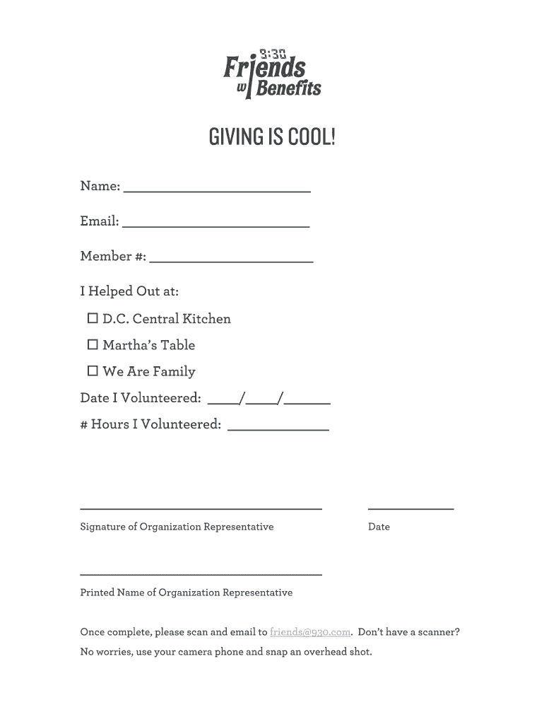 GIVING IS COOL! Name: Email: Member #: I Helped Out at: ! D.C. Central Kitchen ! Martha's Table ! We Are Family Date I Volunteered: / / # Hours I Volunteered: Signature of Organization RepresentativeDate