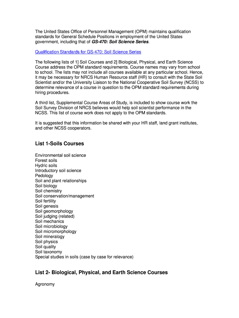 The United States Office of Personnel Management (OPM) maintains qualification standards for General Schedule Positions in employment of the United States government, including that of GS470: Soil