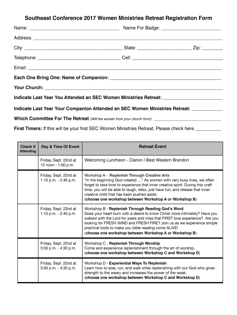 Southeast Conference 2017 Women Ministries Retreat Registration Form Name: Name For Badge: Address: City: State: Zip: Telephone: Cell: Email: Each One Bring One: Name of Companion: Your Church: Indicate