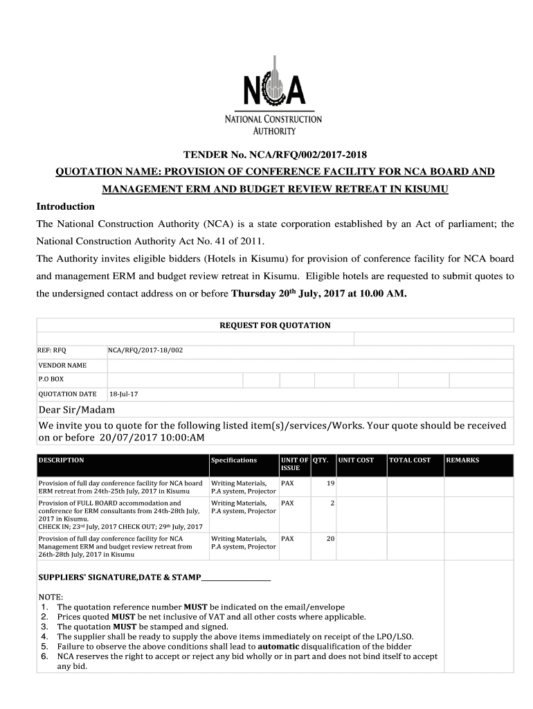 Get the free QUOTATION NAME: PROVISION OF CONFERENCE FACILITY FOR NCA BOARD AND