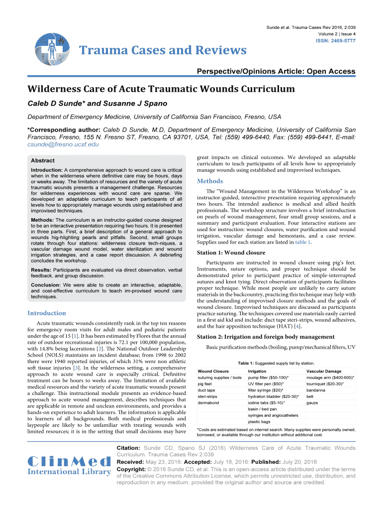 Suede et al. Trauma Cases Rev 2016, 2:039 Volume 2 Issue 4ISSN: 24695777Trauma Cases and ReviewsPerspective/Opinions Article: Open AccessWilderness Care of Acute Traumatic Wounds Curriculum Caleb