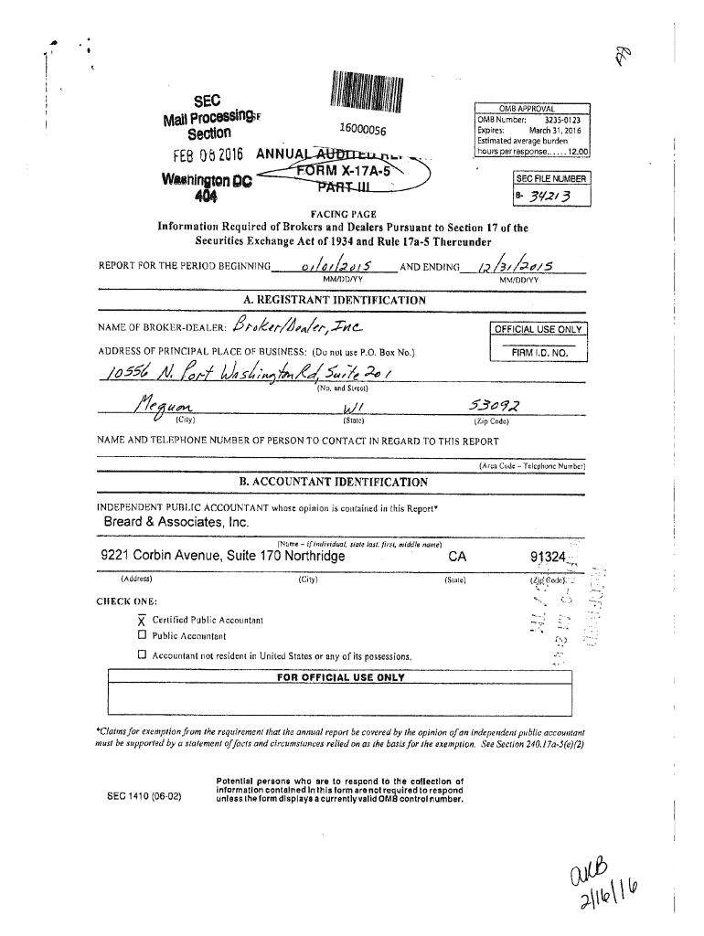 IRI I III NI I IN Ismail ProeesslngRE16000056SectionFEB 0b 2016 ANNUAL UV “fiction Q0OMB APPROVAL OMB Number: 32350123 Expires: March 31, 2016, Estimated average burden Coursera M X1 7A5SEC FILE