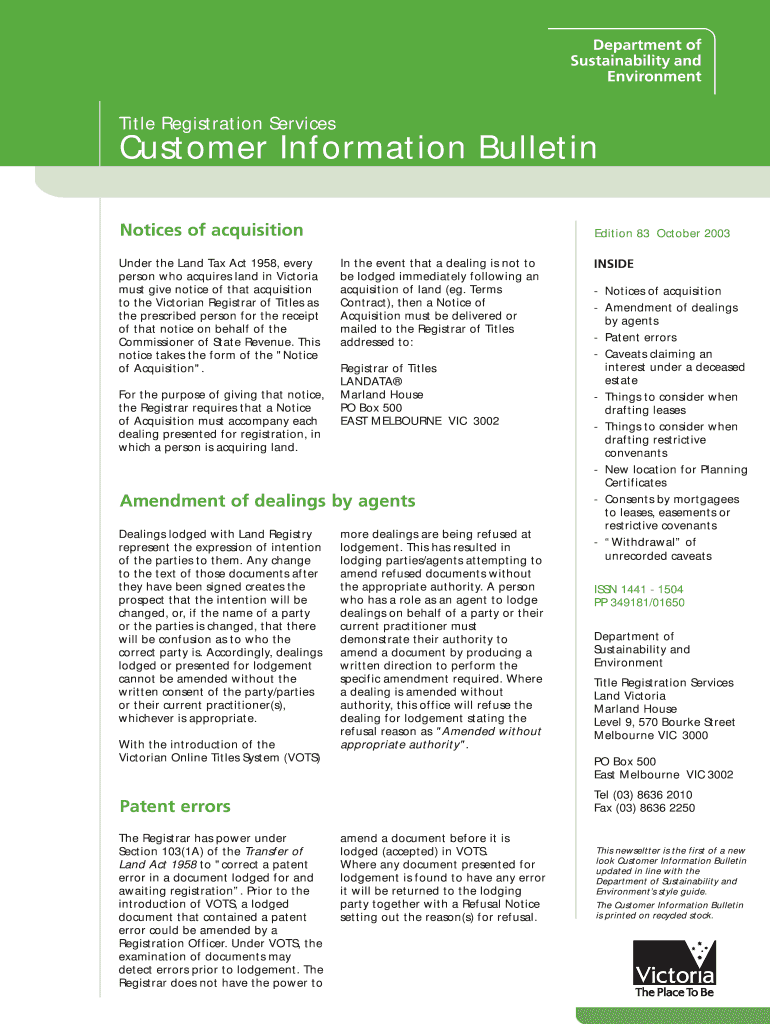 Title Registration ServicesCustomer Information Bulletin Notices of acquisitionUnder the Land Tax Act 1958, every person who acquires land in Victoria must give notice of that acquisition to the Victorian