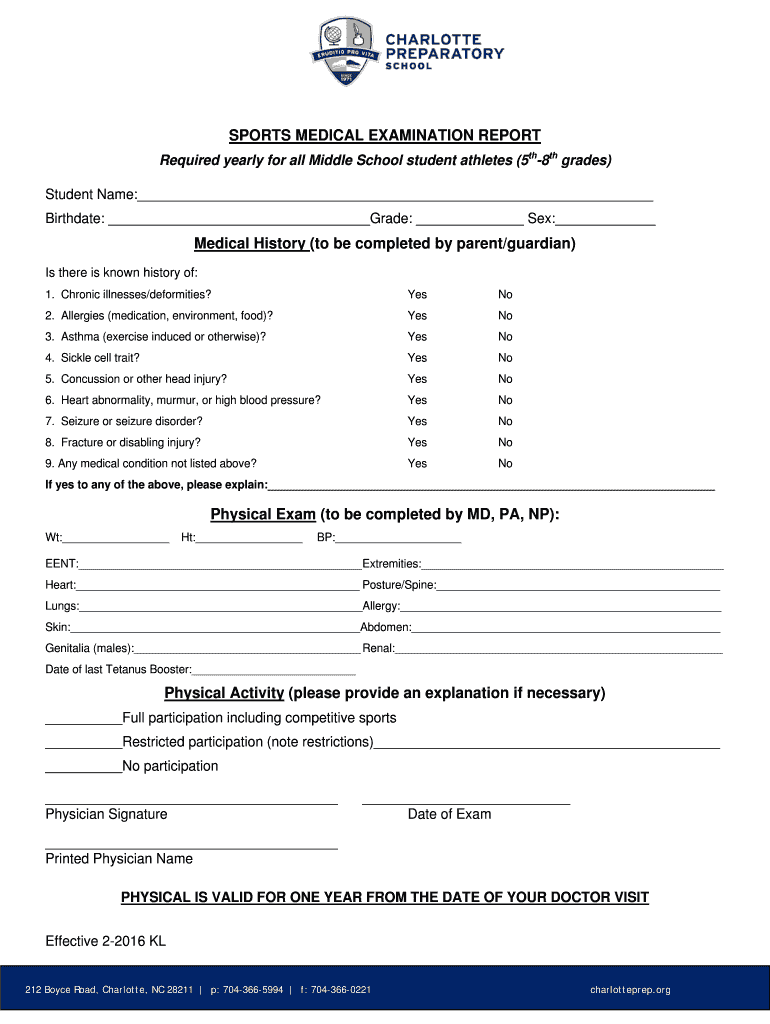 SPORTS MEDICAL EXAMINATION REPORT Required yearly for all Middle School student athletes (5th8th grades) Student Name: Birthdate: Grade: Sex: Medical History (to be completed by parent/guardian) Is