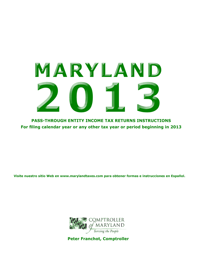 MARYLAND 2013 pass-through entity income tax returns INSTRUCTIONS For filing calendar year or any other tax year or period beginning in 2013 Visit maestro site Web en www.marylandtaxes.com para oftener