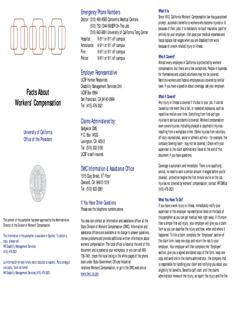 Emergency Phone Numbers Doctor: (510) 465-9565 Concentrate Medical Centers (510) 752-1244 KAISER On-The-Job (510) 642-6891 University of California Tang Center Hospital: 9-911 or 911 off campus Ambulance: